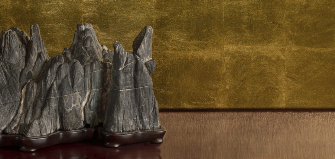 Suiseki (Jap. ‘water and stone’) is an art of Chinese origin, consisting in artistic display of stones whose shape or texture reflects an existing landscape or other natural features. The tradition has a long history, going back to the Kamakura period (1192–1333) in Japan. One of the most popular forms of suiseki is toyamaishi (‘distant mountain’), i.e. a stone representing a single mountain or several pinnacles. Other frequent natural features are waterfalls, bodies of water, plateaus, or islands. In addition to such landscape motifs, suiseki also involves shapes representing picturesque details: the worn thatch of an alpine cottage or a boat abandoned at water’s edge; there are also stones resembling animals or human figures; yet another category comprises ones with a floral pattern or other natural elements seen on their surface.
